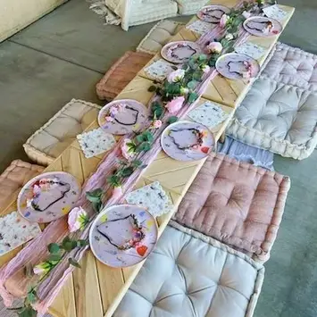 Gather your friends for a luxurious picnic experience that you’ll never forget. Whether it’s an intimate gathering or a large celebration, we create a beautifully curated setting that will have everyone talking for ages. Relax and enjoy your time around our low-profile picnic tables with comfortable pillows and poufs for a cozy and stylish atmosphere.